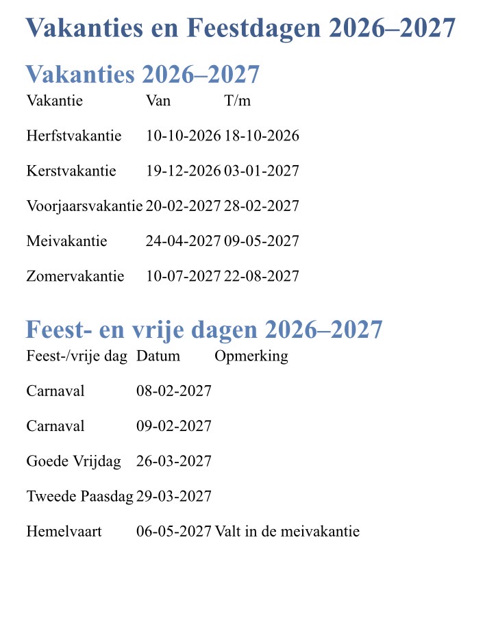 Voorjaarsvakantie 21-02-26 tot en met 01-03-26